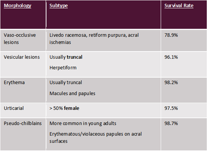Though the presentations can be varied, a recent systematic review performed by Tan SW et al demonstrated that they can be divided into 5 main categories – vaso-occlusive lesions, vesicular lesions, erythema, urticarial and pseudo-chilblains lesions (see Table 1)(3). Each of these various morphologies has been associated with variable survival rates, with vaso-occlusive lesions being associated with higher mortality in patients.