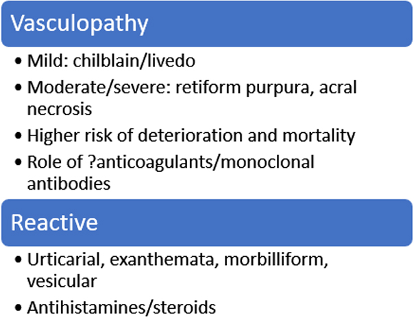 Dermatologists play an important role in accurately diagnosing dermatoses during this pandemic, especially when some cases may be asymptomatic at the time of cutaneous presentation. With this proposed dichotomy, it may better help us take care of our patients and help guide clinical management in a multidisciplinary setting.