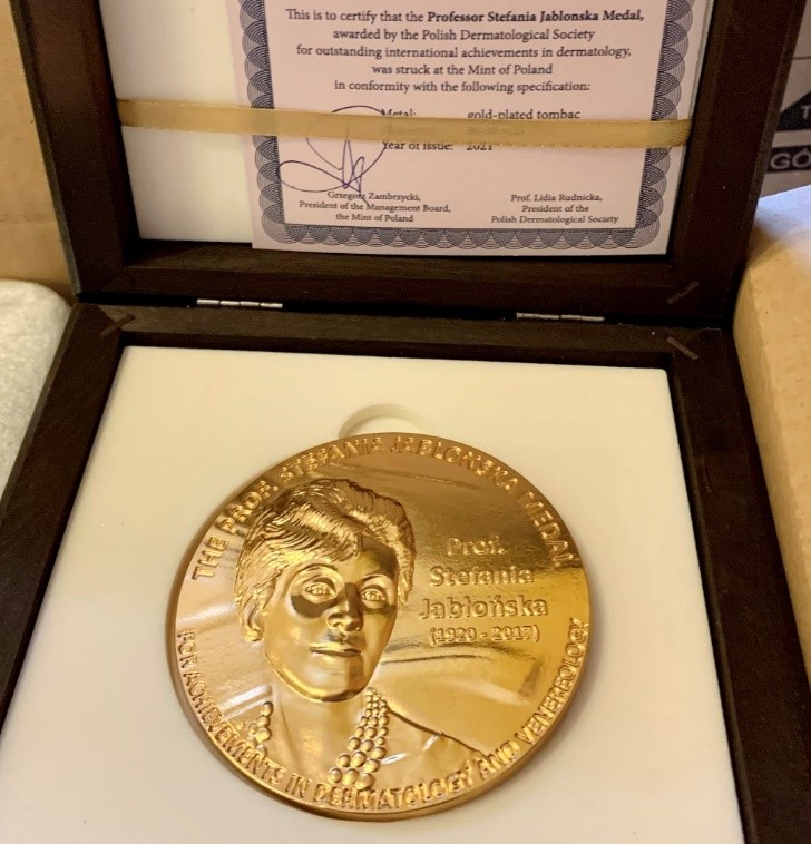 To celebrate the memory of this exceptional dermatologist, The Stefania Jablonska Medal was established as highest award of the Polish Dermatological Society for outstanding achievements in dermatology. On the occasion of its 100-th anniversary the Polish Dermatological Society awarded with the Medal to Jean Bologna (USA), Henry Lim (Canada) and Suzanne M. Olbricht (USA), Marek Haftek (France/Poland), Andrzej Kaszuba (Poland), Andrzej Langner (Poland) and Anna Sysa-Jedrzejowska (Poland). The Award Ceremony, planned for May 2020, was postponed until after the pandemic.